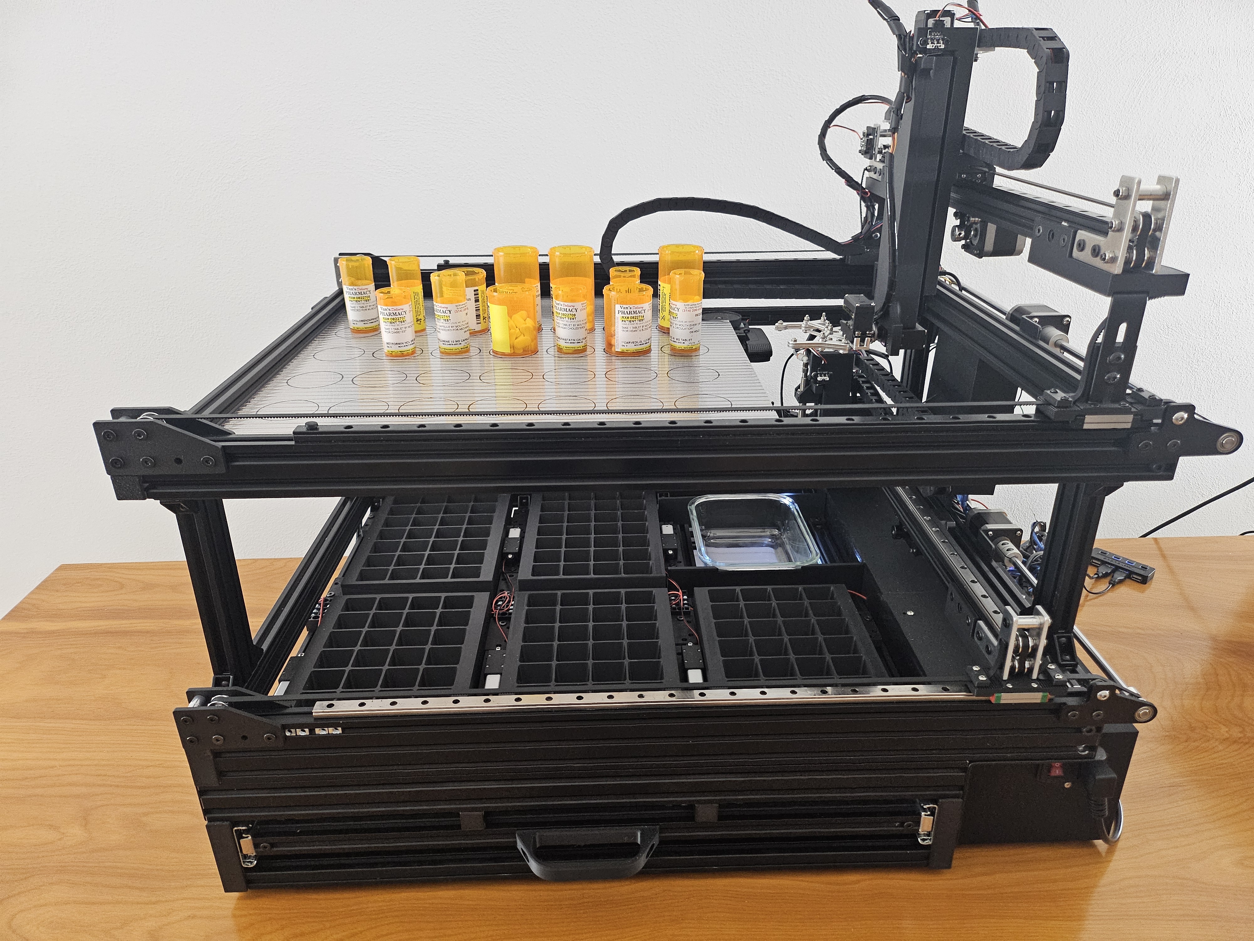 - The PICK AND PLACE ROBOT processes pills from the container in cycles of up to 30 pills: stage → inspect → drop.